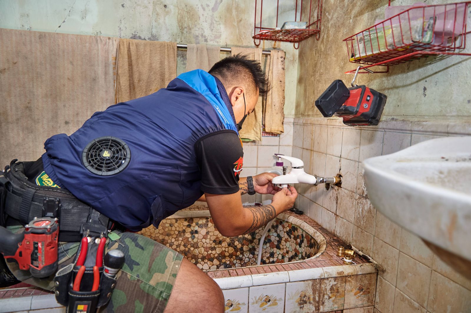 87歲的洪顏奶奶因中風及膝蓋手術行動不便,長年依靠助行器。家中浴室水龍頭長期滲漏,加上地面濕滑,她每次洗澡都提心吊膽卻無力改善。透過介惠基金會牽線職人志工協助修繕,浴室加裝了防滑設施並修復水龍頭,她安心地說:「洗澡不用擔心會跌倒了。」