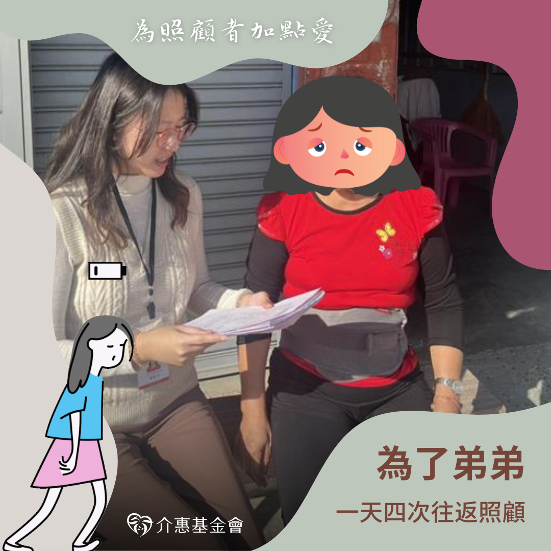 在父母相繼過世後,照顧弟弟的責任就落在阿芳(化名)一個人身上。弟弟自小罹患精神疾病,成年後又因車禍長期臥床,生活無法自理。